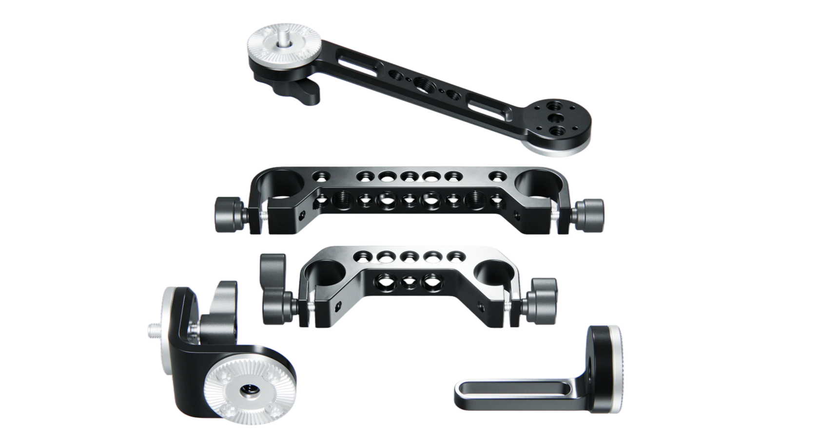The position and orientation of the cinema camera within the studio space are tracked by the ViewGA Camera Tracker, which is securely mounted on the camera rig.